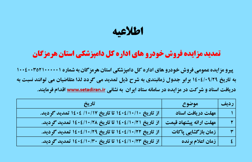 اداره کل دامپزشکی استان هرمزگان در نظر دارد 13 دستگاه خودرو که شامل 8 دستگاه آن با  قابلیت شماره گذاری شامل: ( چهار  دستگاه پیکاب دو کابین و یک دستگاه کاپرا ، یک دستگاه مزدا تک کابین و دودستگاه مزدا دو کابین ) و 5 دستگاه اسقاطی شامل: (سه  دستگاه وانت دوکابین مزدا و یک دستگاه وانت تک کابین مزدا و یک دستگاه وانت تک کابین آریسان ) را از طریق مزایده عمومی و با بهره گیری از سامانه تدارکات الکترونیکی دولت (ستاد) به آدرس www.setadiran.ir با شماره مزایده  1004003521000001 به صورت الکترونیکی به فروش برساند.