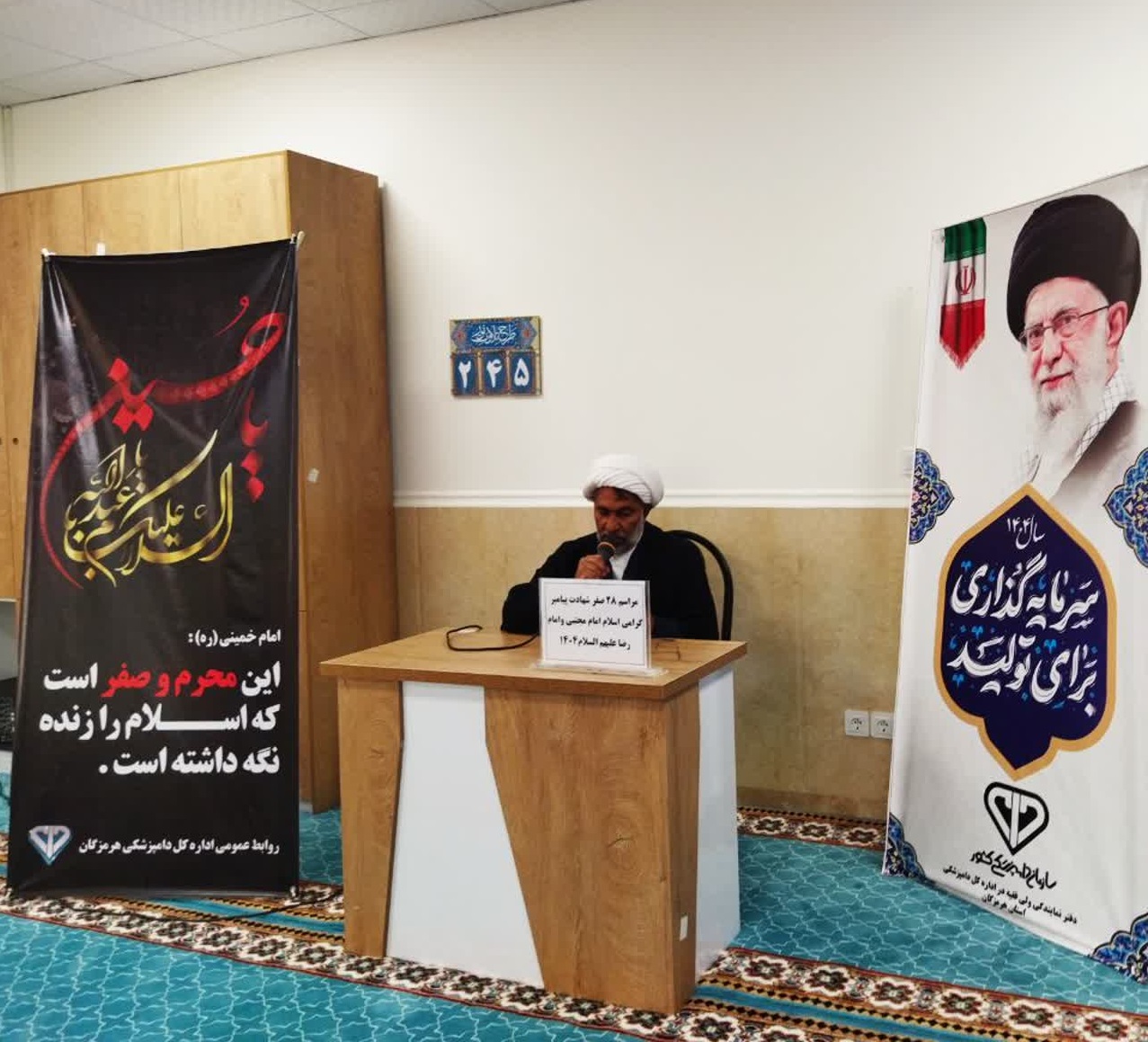 به گزارش روابط عمومی اداره کل دامپزشکی استان هرمزگان، به مناسبت فرارسیدن ایام پایانی ماه صفر، این مراسم عزاداری که به همت دفتر نمایندگی ولی فقیه در دامپزشکی استان و مطابق برنامه های شورای فرهنگی اداره کل دامپزشکی استان هرمزگان، با حضور کارکنان اداره کل دامپزشکی استان هرمزگان در نمازخانه این اداره برگزار شد.