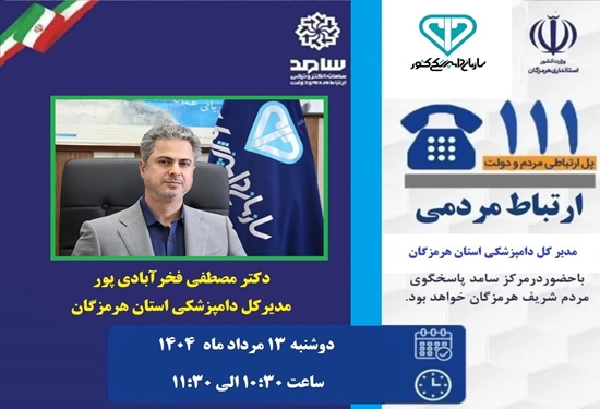 به اطلاع هم استانی های عزیز میرساند در راسـتای سیاست های دولت چهاردهم و در جهت ایجاد بستری مناسب برای برقراری ارتباط دو سویه و صمیمانه بین مردم و مسئولان و پاسخگویی مستقیم و بی واسطه به درخواست ها و مشکلات هم استانیهای عزیز از طریق سامانه سامد ۱۱۱ (سامانه الکترونیکی ارتباط دولت و مردم)، جناب آقای دکتر مصطفی فخرآبادی پور مدیر کل دامپزشکی استان هرمزگان  روز دوشنبه سیزده مرداد ماه ۱۴۰۴  از ساعت ۱۰:۳۰ الی ۱۱:۳۰ در دفتر سامد حضور و به تماس ها، درخواست و مشکلات شهروندان مستقیماً پاسخ خواهند گفت و هم استانیهای عزیز می‌توانند در زمان مقرر با سامانه ۱۱۱ تماس و بدون مراجعه حضوری سؤالات، درخواست ها و مشکلات خود را مطرح کنند.