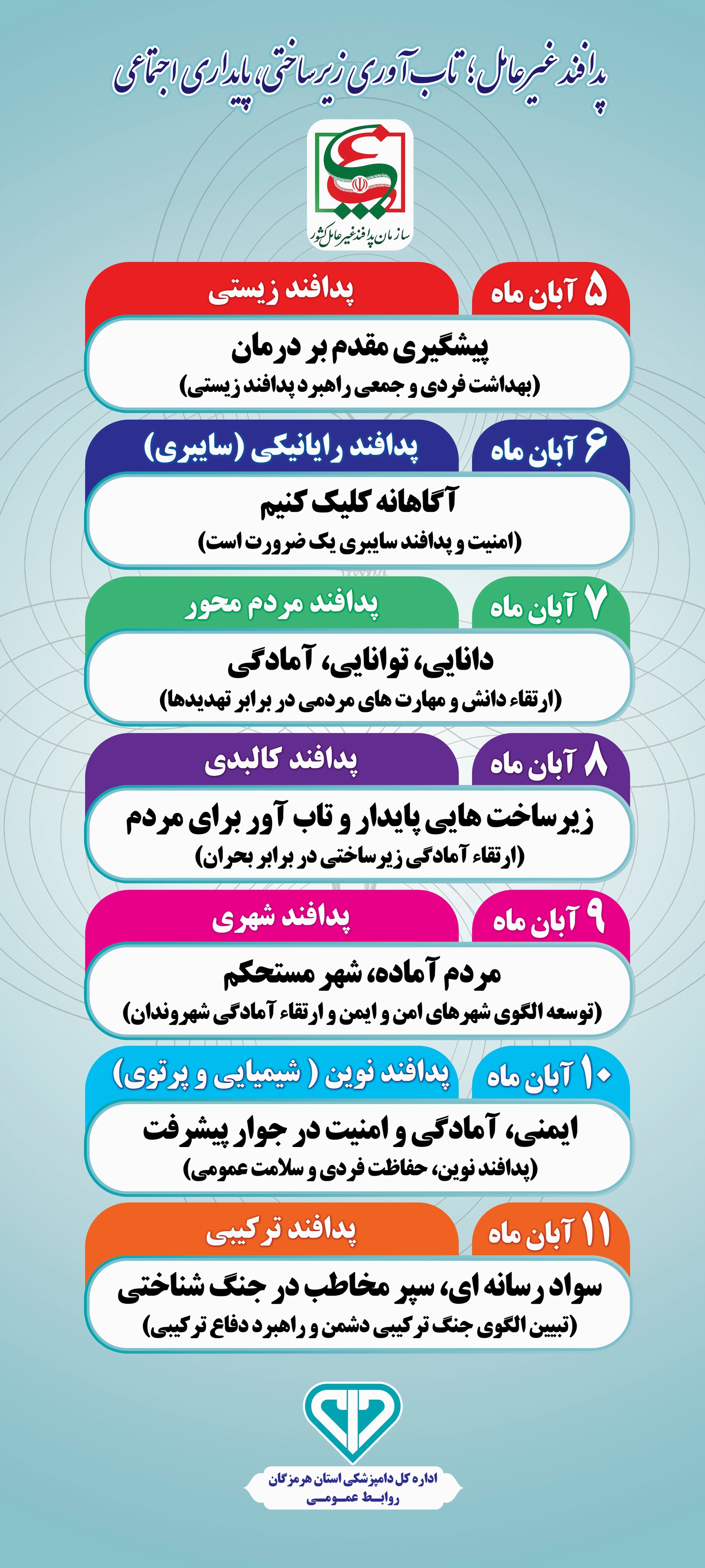 پدافند غیرعامل؛ در تمام دستگاه ها، موضوعی حائز اهمیت است، که زیرساخت های توسعه را، استحکام می بخشد و اهمیت آن همواره مورد توجه بزرگان نظام مقدس جمهوری اسلامی ایران، علی الخصوص مقام معظم رهبری (مدظله العالی) است، در ایام نکوداشت پدافند غیرعامل ۱۴۰4 با شعار «پدافند غیرعامل؛ تاب آوری زیر ساختی، پایداری اجتماعی» با همدلی و هم افزایی در راستای تحقق این مهم، گام برداریم و از میهنمان حفاظت کنیم.